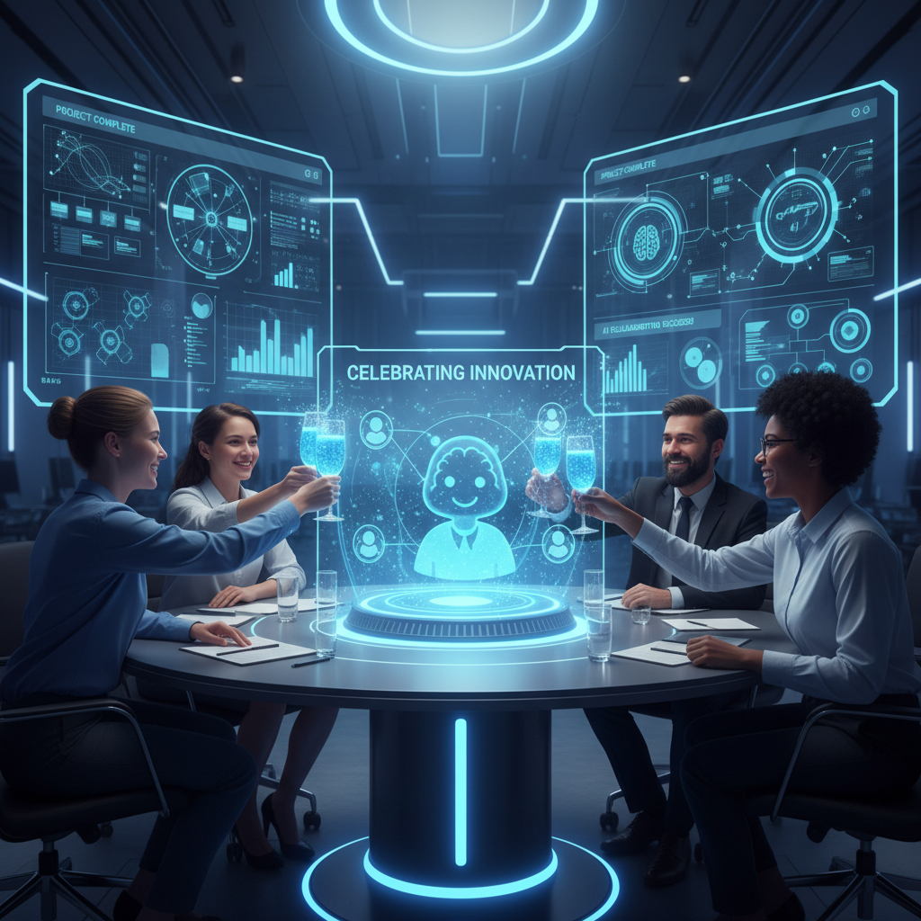 Image: Team celebrating a collaborative win with their digital AI assistant, symbolizing the new possibilities in enterprise teamwork.