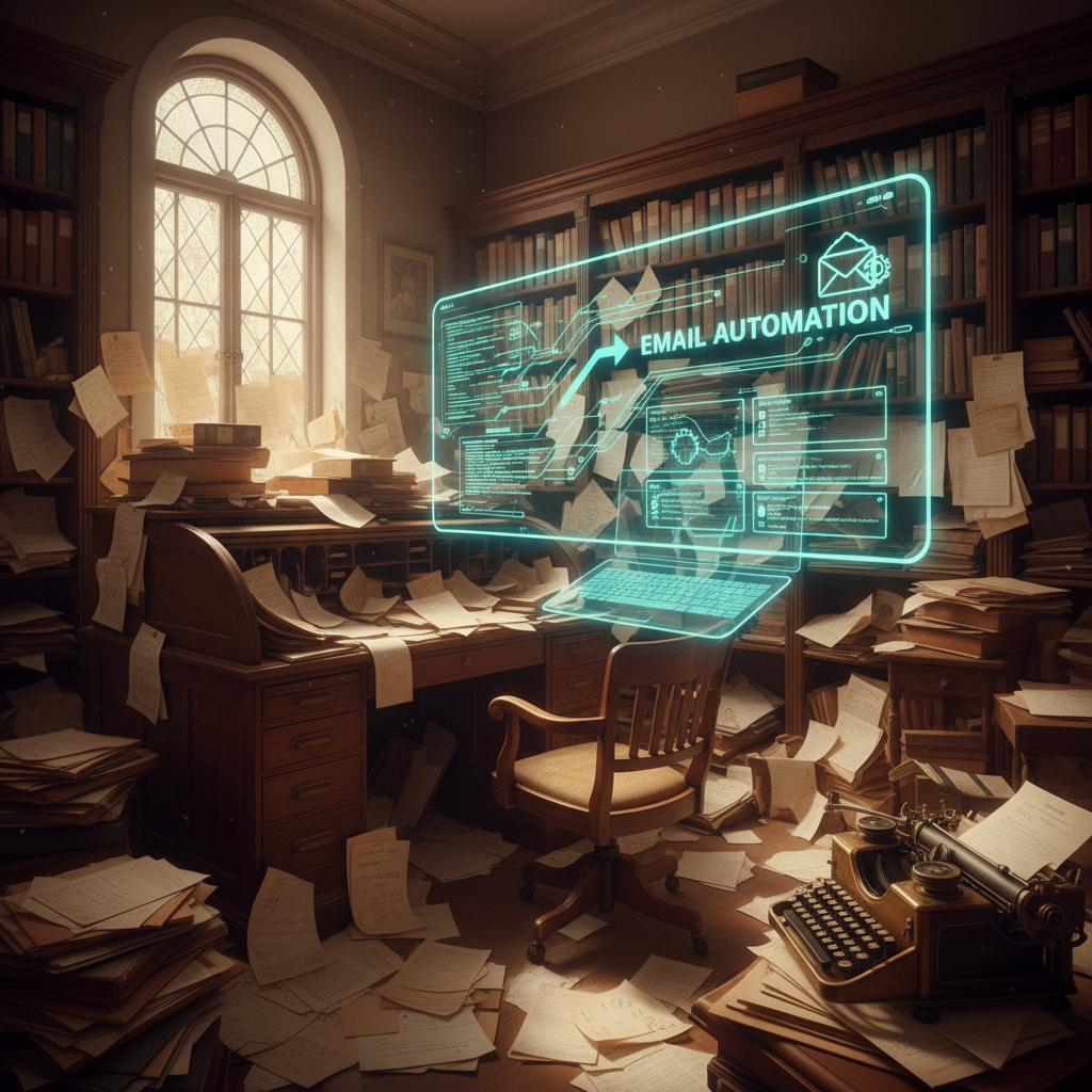 Contrast between old-school chaos and modern email task automation.