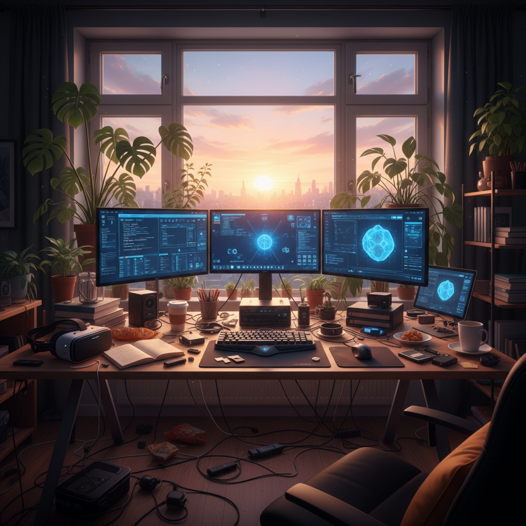 Alt text: Editorial photo of a cluttered desk transforming into a streamlined digital workspace at sunrise, highlighting the shift to automation assistants in 2025.
