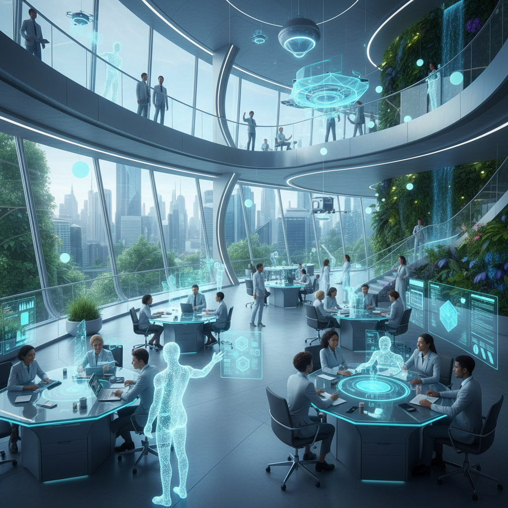 Alt text: Futuristic office scene showing seamless collaboration between humans and AI teammates in a dynamic, optimistic environment.