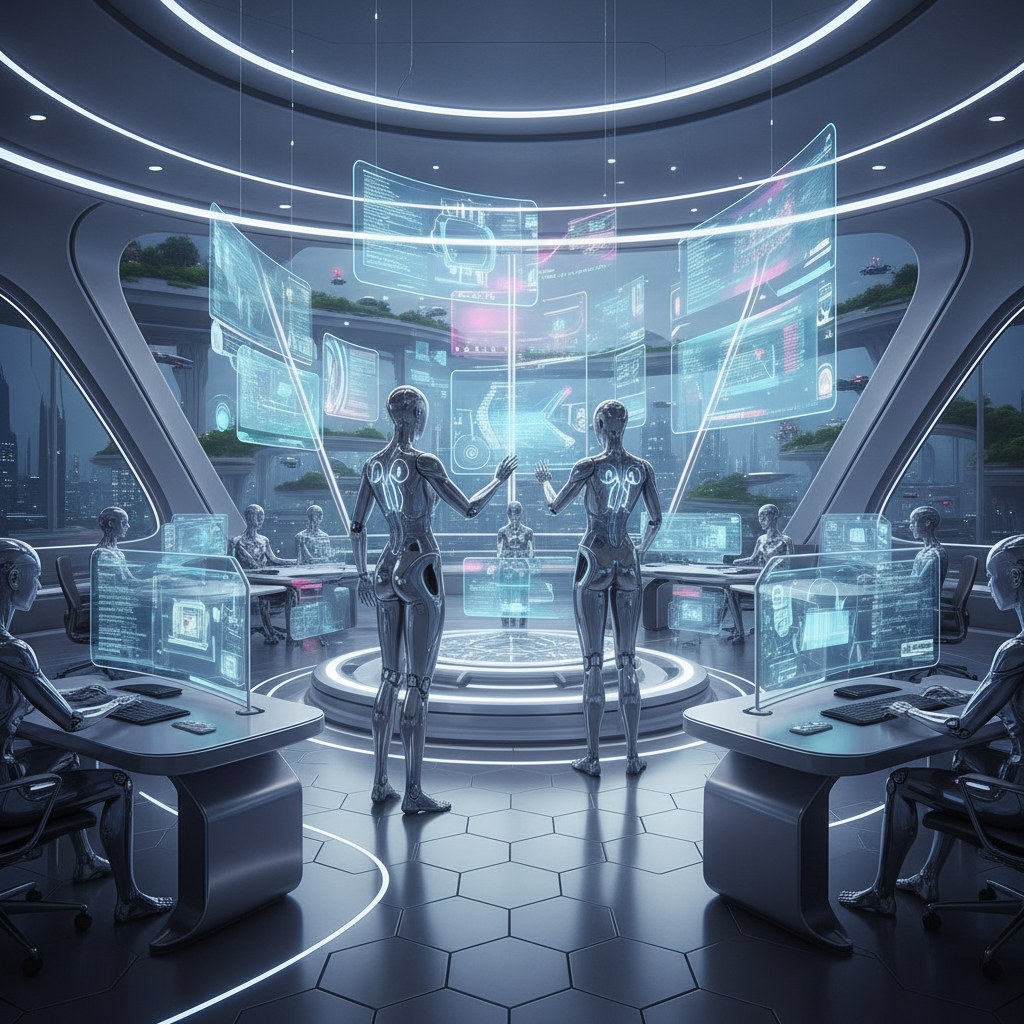 Futuristic enterprise where business process automation AI and humans collaborate seamlessly.