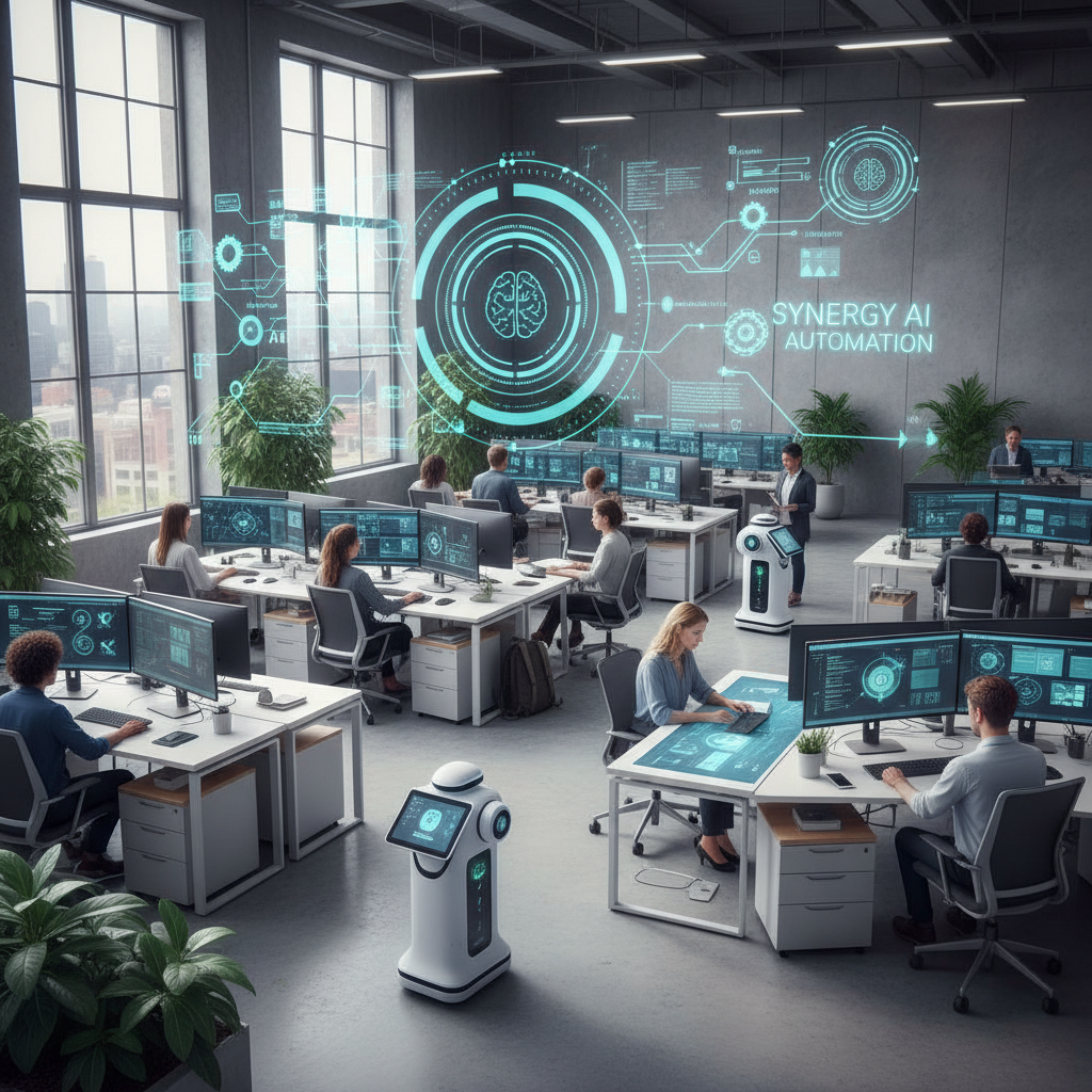 Modern office scene illustrating layered AI workflow automation in business process automation AI.