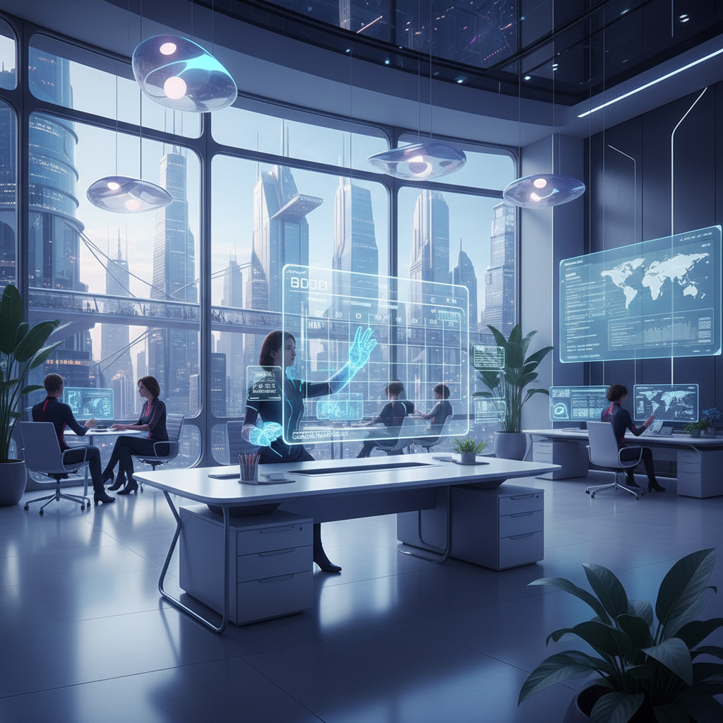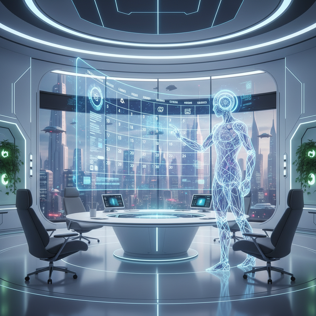 AI-powered calendar controller transforming into a digital assistant, surrounded by professionals in a futuristic office.