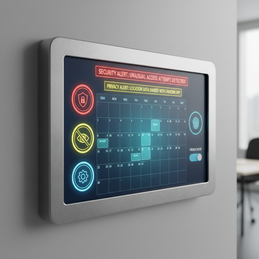 Photo of a digital calendar controller interface displaying security and privacy alerts, with professionals adjusting settings.