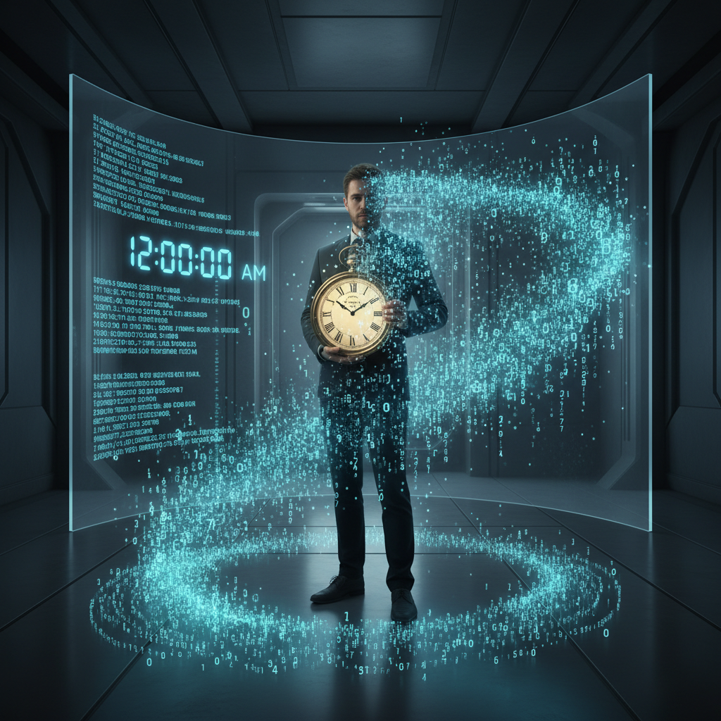 Photo of a person holding a physical clock, surrounded by digital time streams, symbolizing the balance between analog and digital time control.