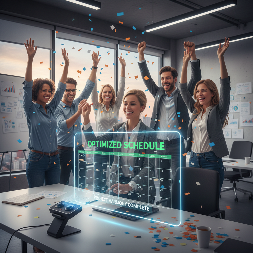 Photo of a diverse team celebrating in front of a digital dashboard displaying optimized schedules with a visible calendar controller interface.