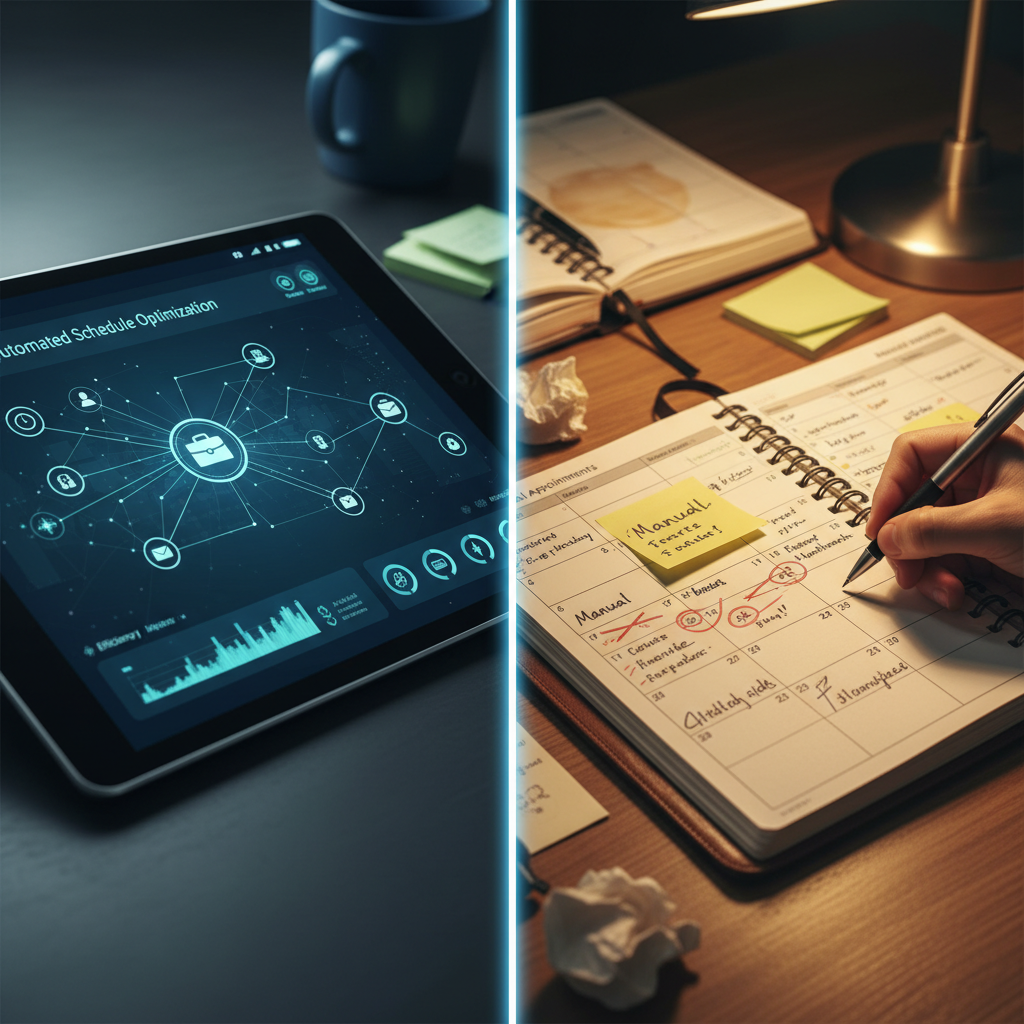Alt text: Split screen showing automated vs manual calendar scheduling, highlighting the contrast in workflow approaches.