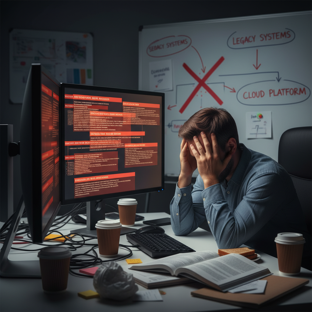 Alt text: IT manager facing integration issues, with error messages and software icons, highlighting the battlefield of calendar processor integrations.
