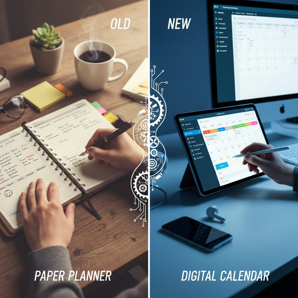 Alt text: Paper planners and digital calendar in contrast, symbolizing the clash of old and new calendar paradigms with strong editorial focus.