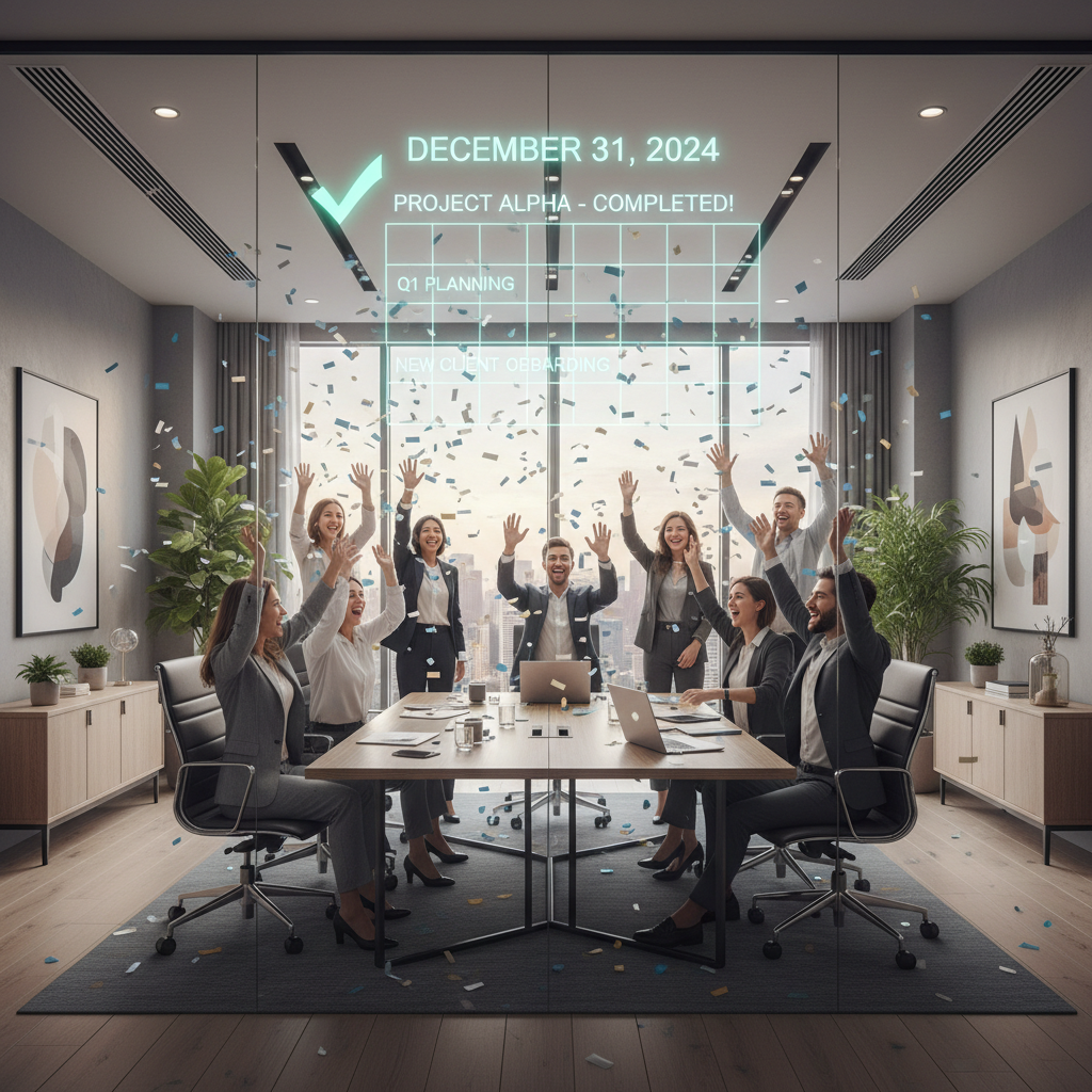 Alt text: Team celebrating in a modern office with a digital calendar displayed, illustrating schedule clarity after adopting an intelligent calendar processor.