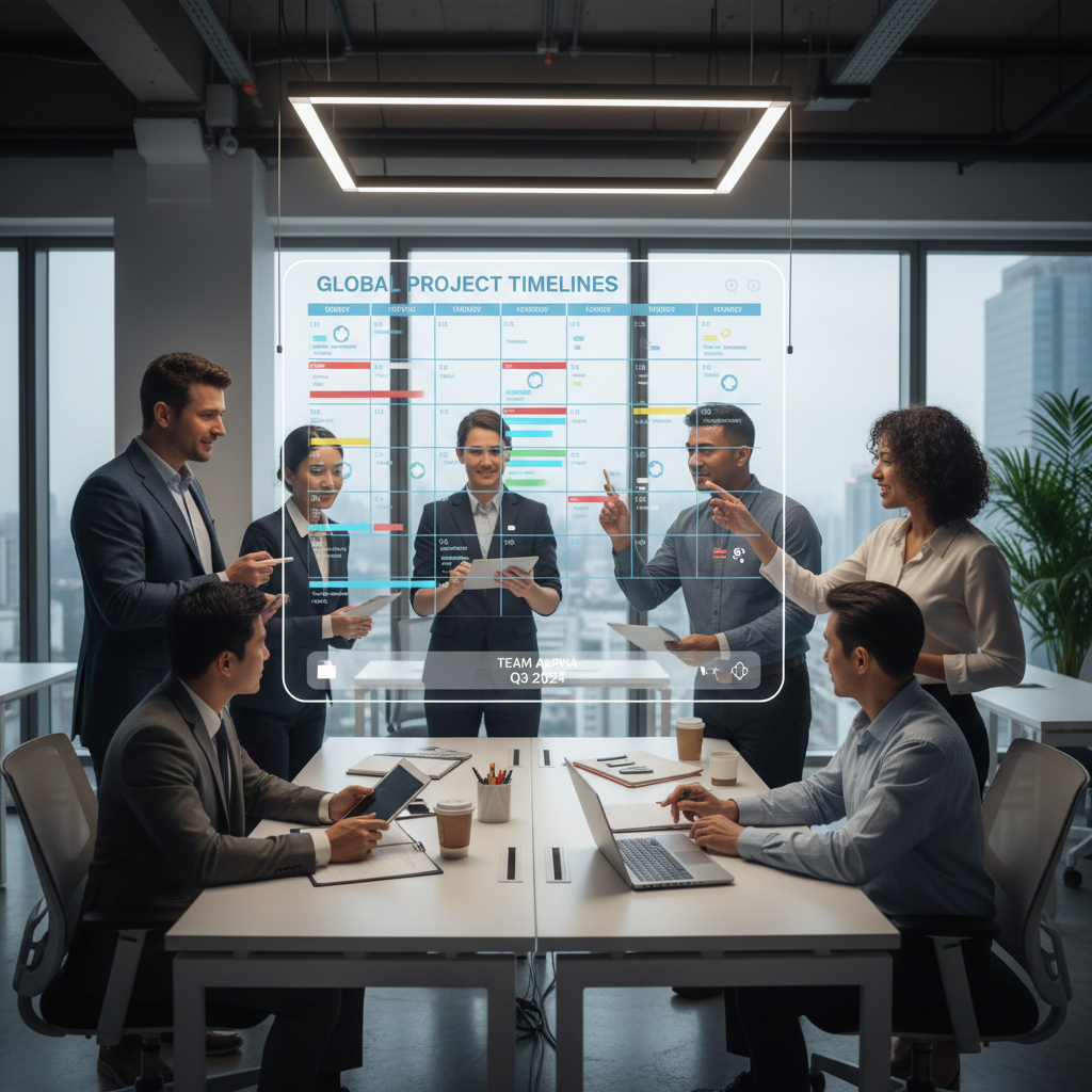 Alt: Diverse group of professionals strategizing around a large digital scheduling dashboard, representing the next generation of calendar experts.