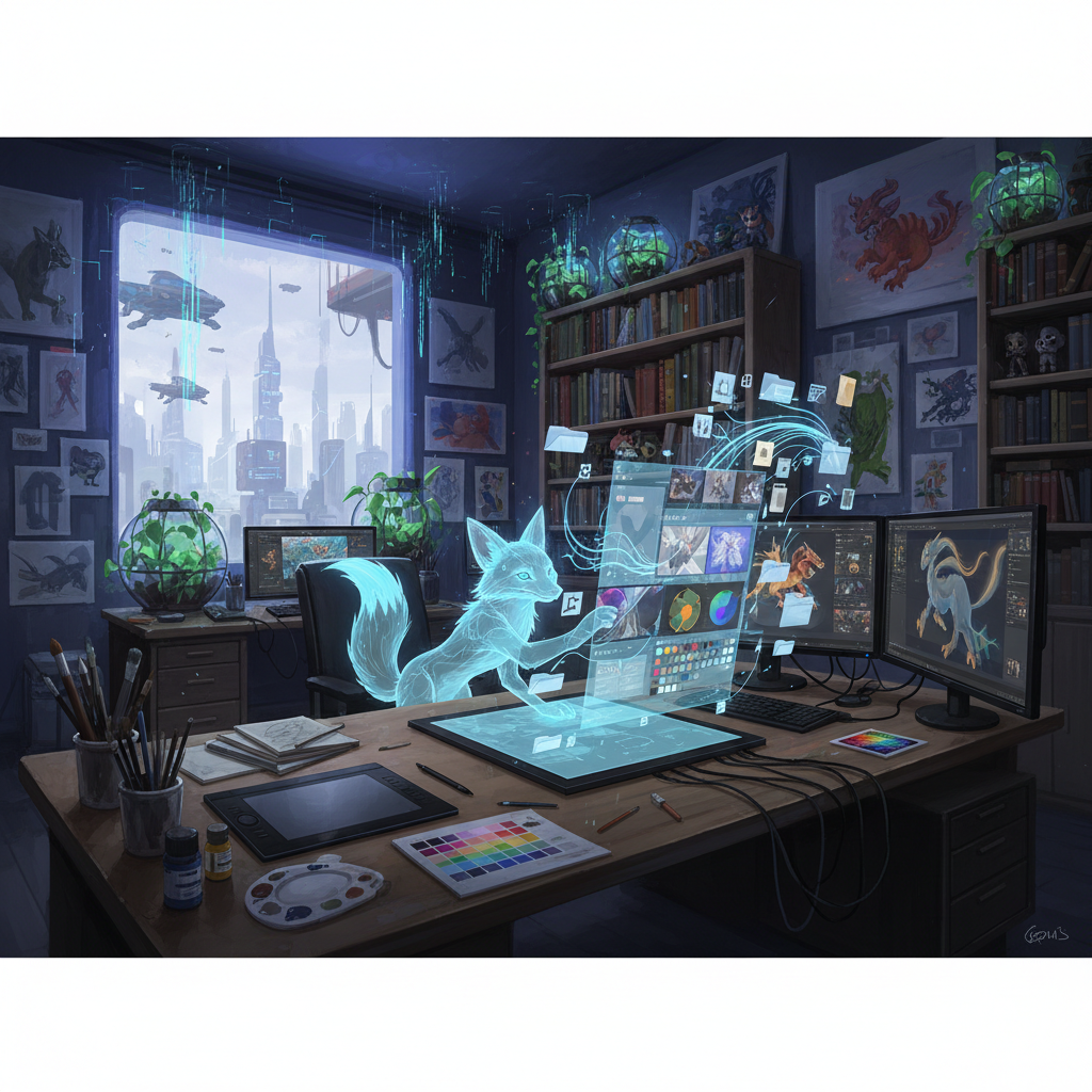 Artistic workspace photo showing digital assistant supporting creative organization.