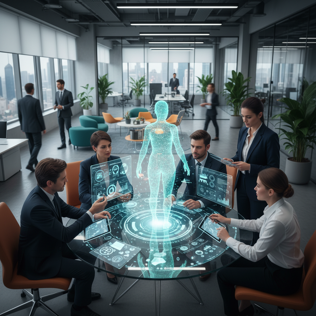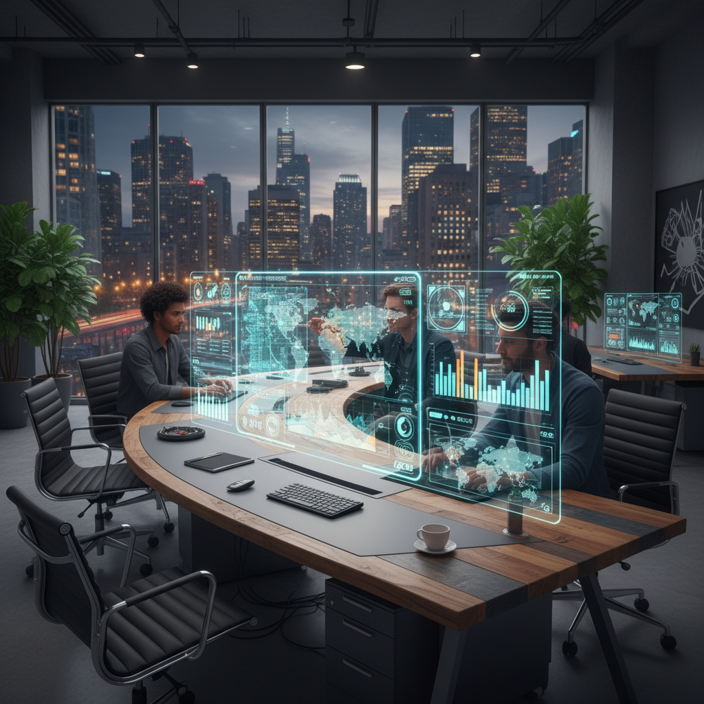 Futuristic office photo with AI holograms, representing the evolution of cheap assistants.
