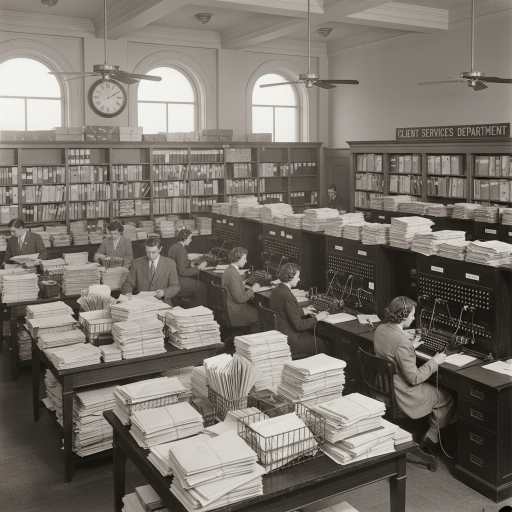 Alt: Early client service professionals at work in an analog office, highlighting teamwork and history of the profession.