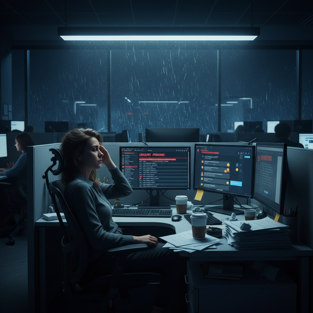 Photo: A support agent overwhelmed by endless client service tickets—an all-too-common scene in modern enterprises.