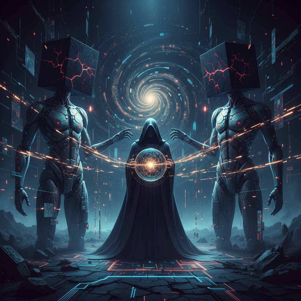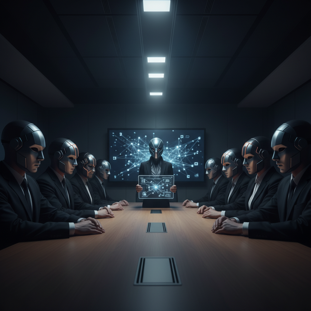 Image: Identical figures seated in a circle, each staring blankly ahead. Symbol of consensus culture’s dark side—conformity over results.