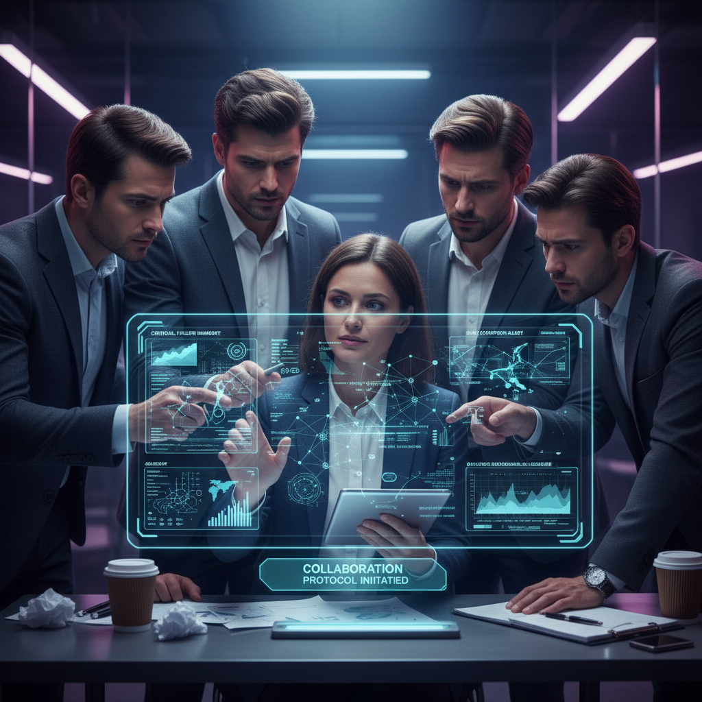 Image: A tense, diverse team sits around a glowing digital dashboard, embodying the emotional toll of failed collaboration in high-pressure enterprise settings.