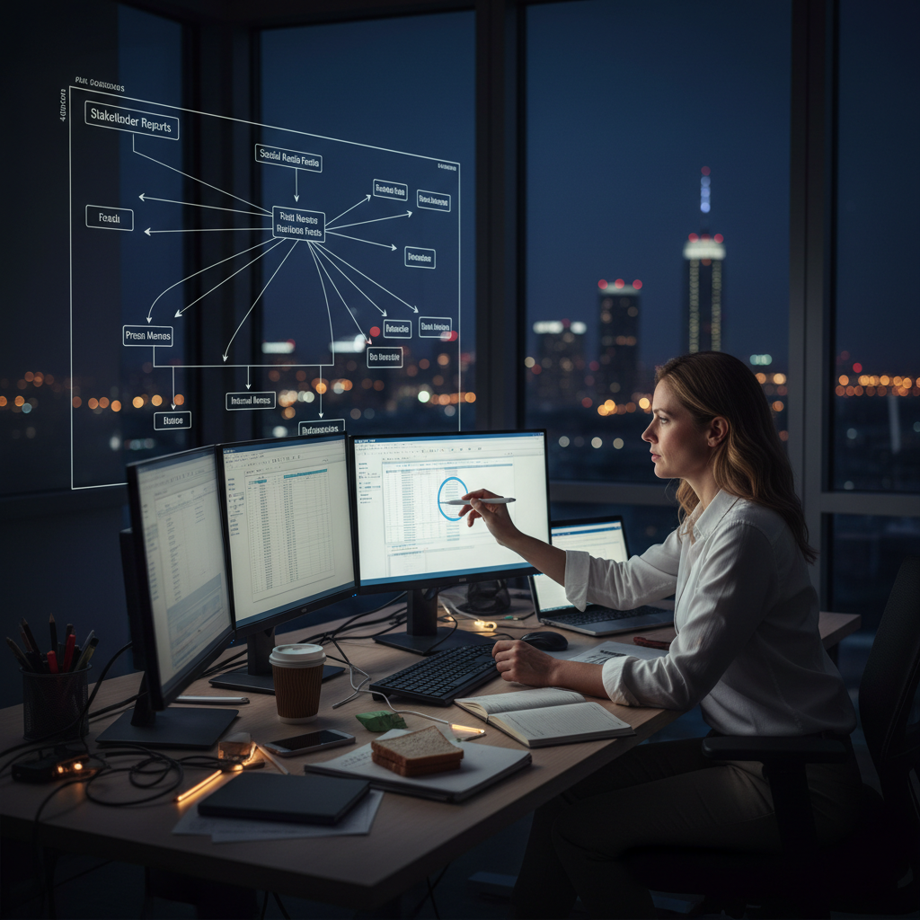 Alt: Communication coordinator working late to align team information flows and prevent miscommunication