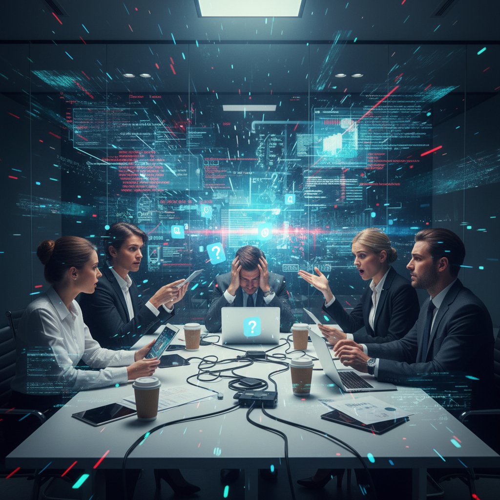 Alt: Team struggling with miscommunication during a critical meeting, highlighting communication coordinator challenges