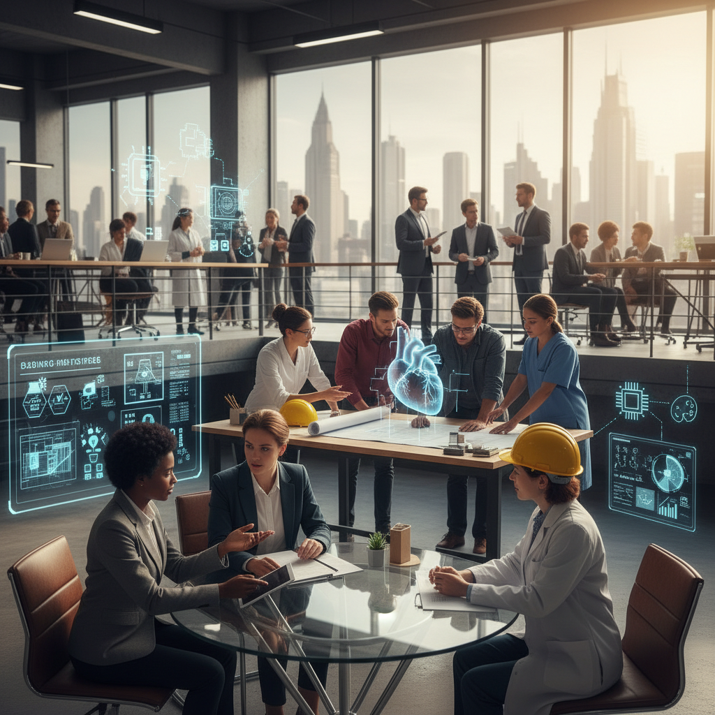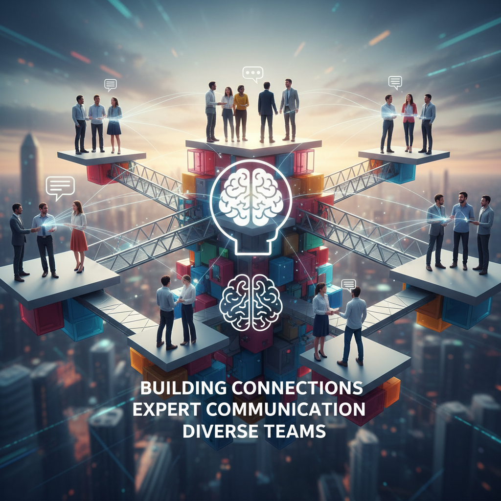 Building new connections through expert communication, symbolic bridge between diverse teams, hopeful urban setting