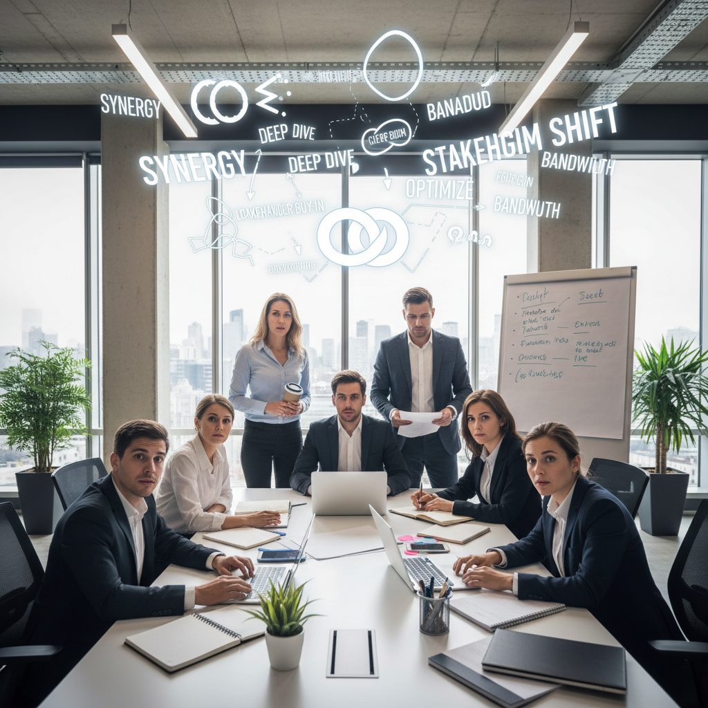Team members confused by communication jargon, satirical illustration, office setting, lost in a sea of technical terms