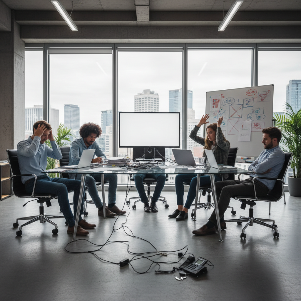 Frustrated team members in a tense meeting, communication breakdown, digital overlays show broken connections
