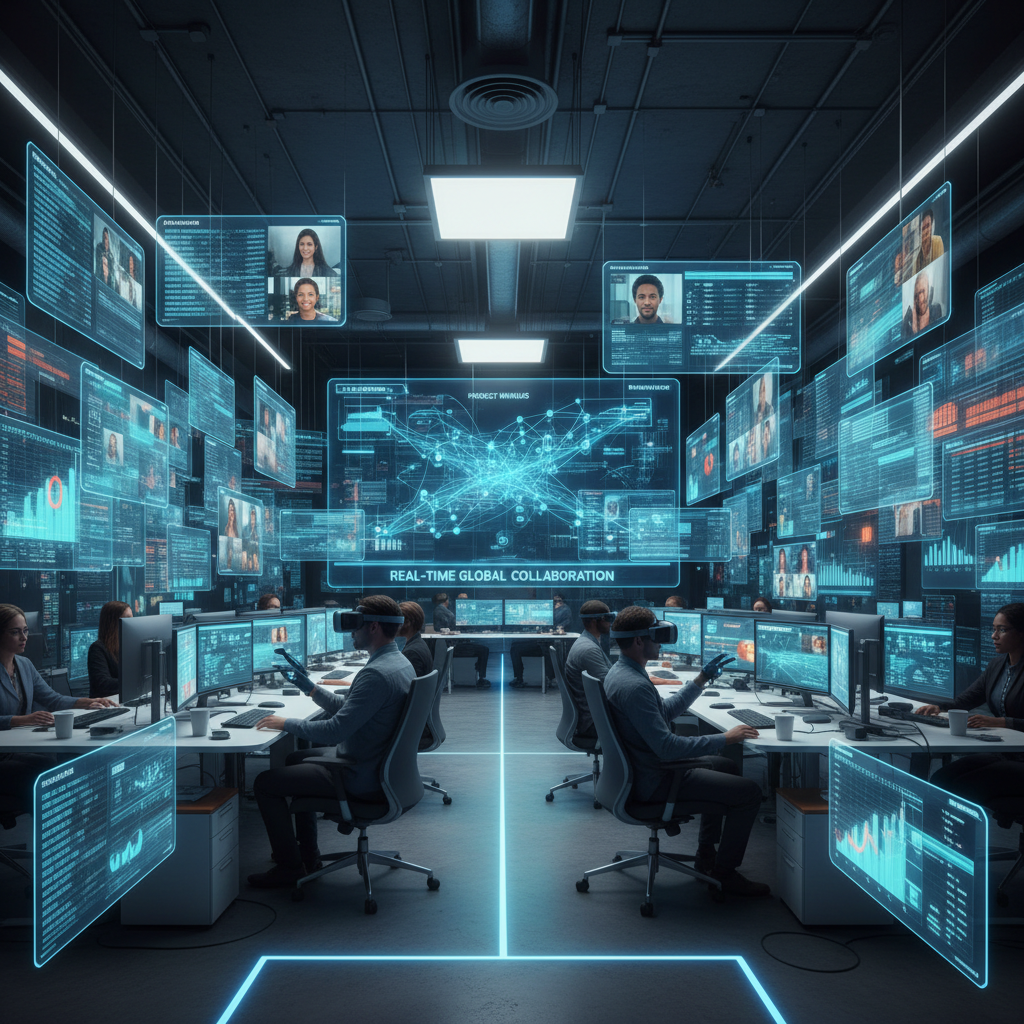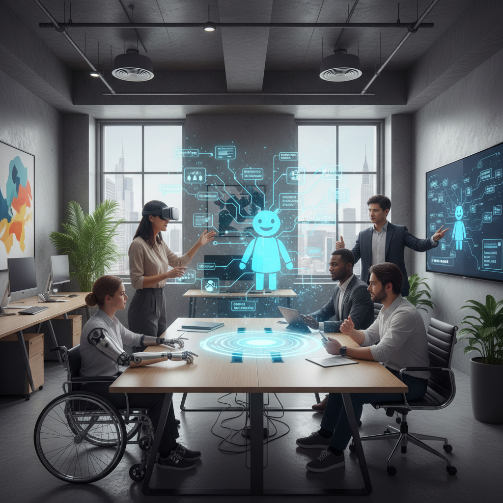 Alt text: Diverse team collaborating, with a digital assistant streamlining workflows in the background