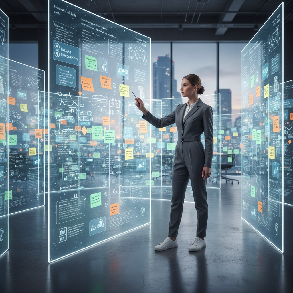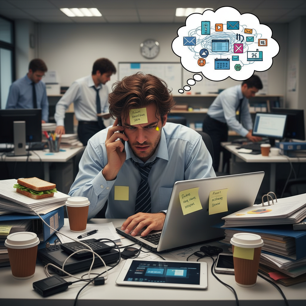 Picture the modern employee managing complexity: navigating a maze of sticky notes, digital screens, and Slack messages, all while keeping the bigger picture in focus.
