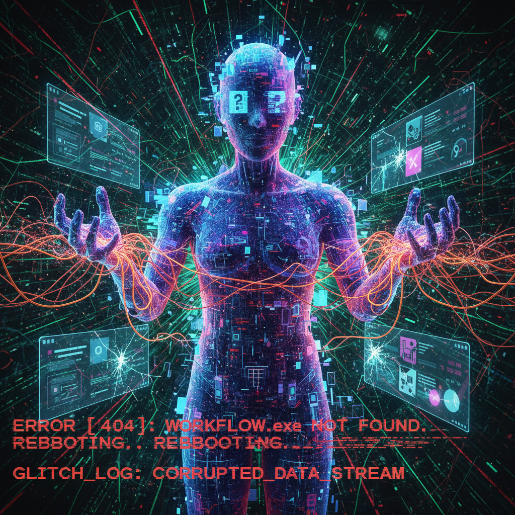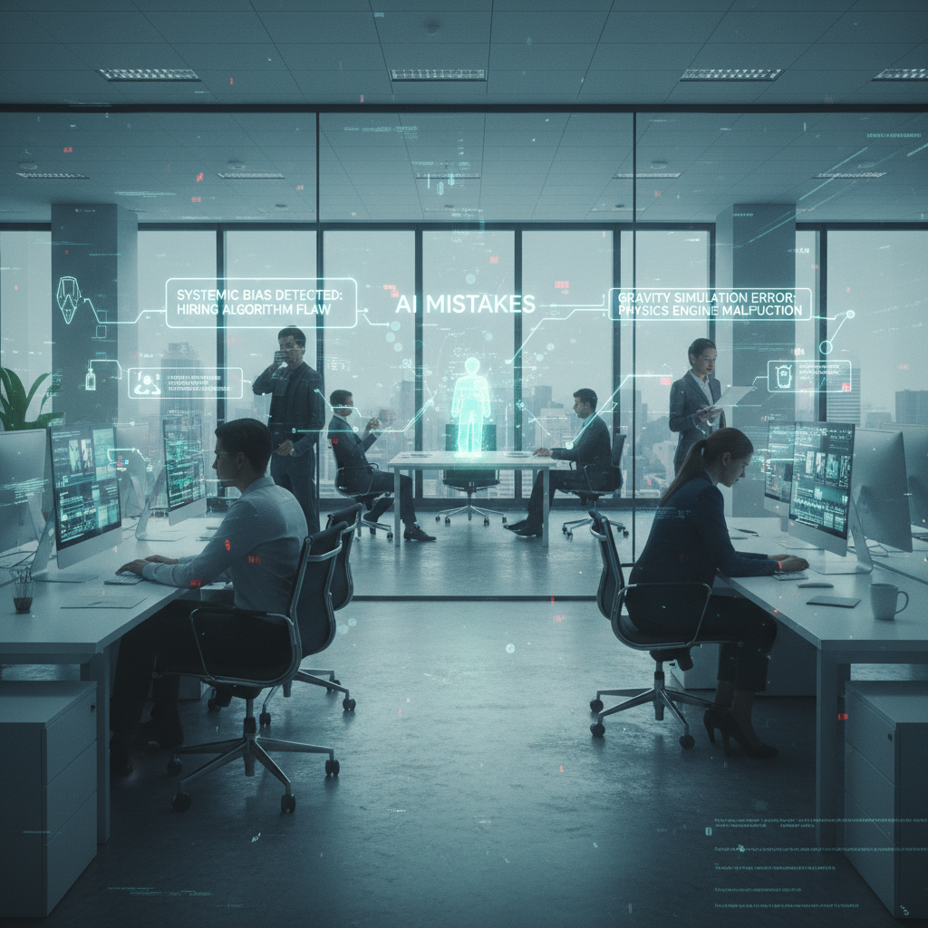 Alt text: Symbolic photo of invisible AI errors causing cascading problems in a workplace, representing the risks of incompetent digital helpers.