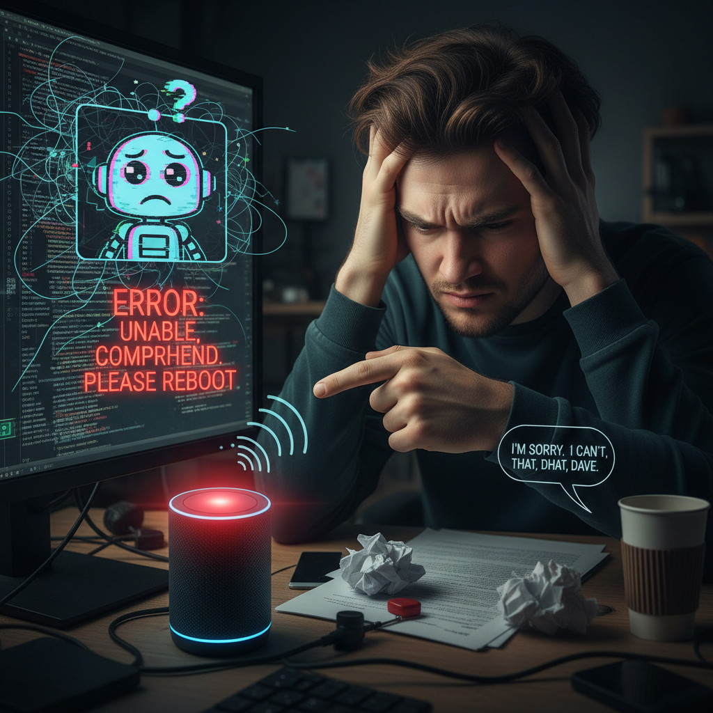 Alt text: Photo of a frustrated employee facing an incompetent AI helper in an office, illustrating workplace productivity challenges.