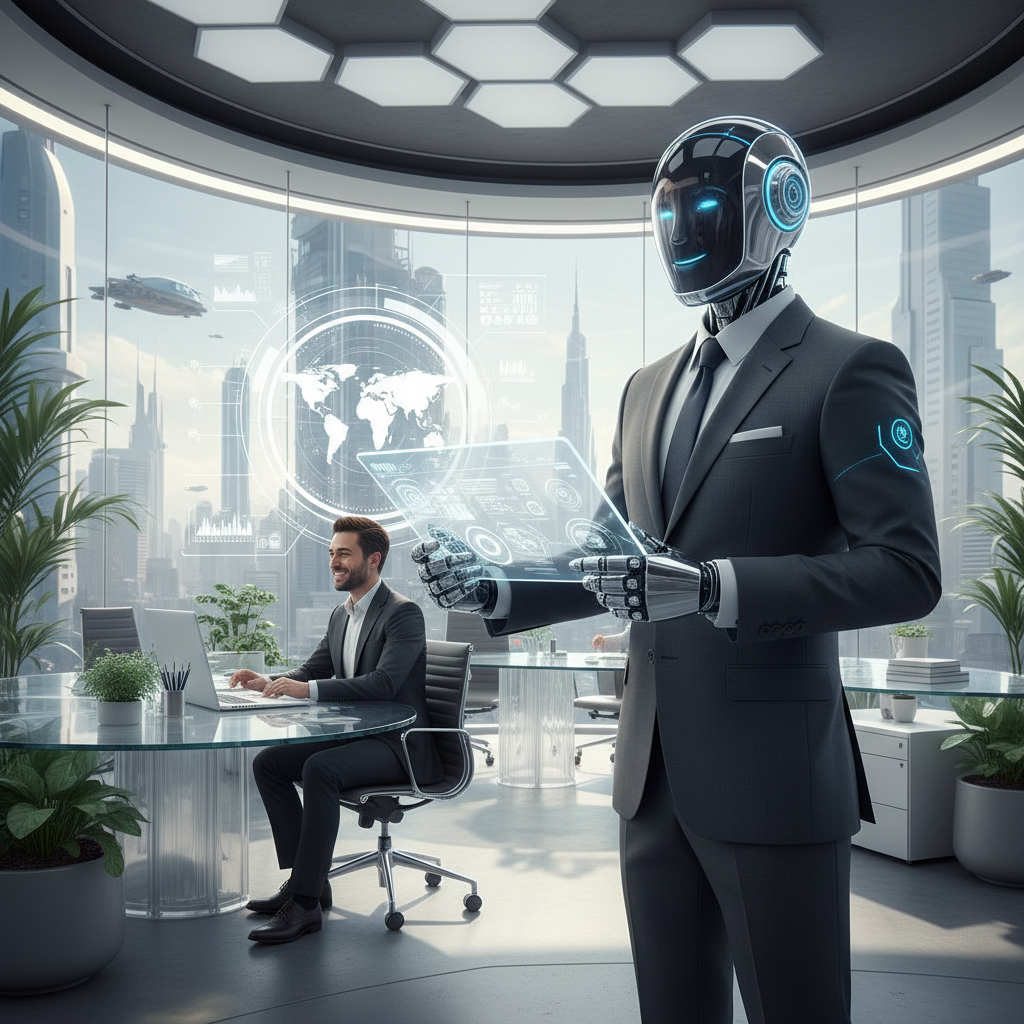 Alt text: Abstract photo showing the evolution of a competent helper from human assistant to AI in a modern enterprise setting, with keywords: AI teammate, competent helper, enterprise support.