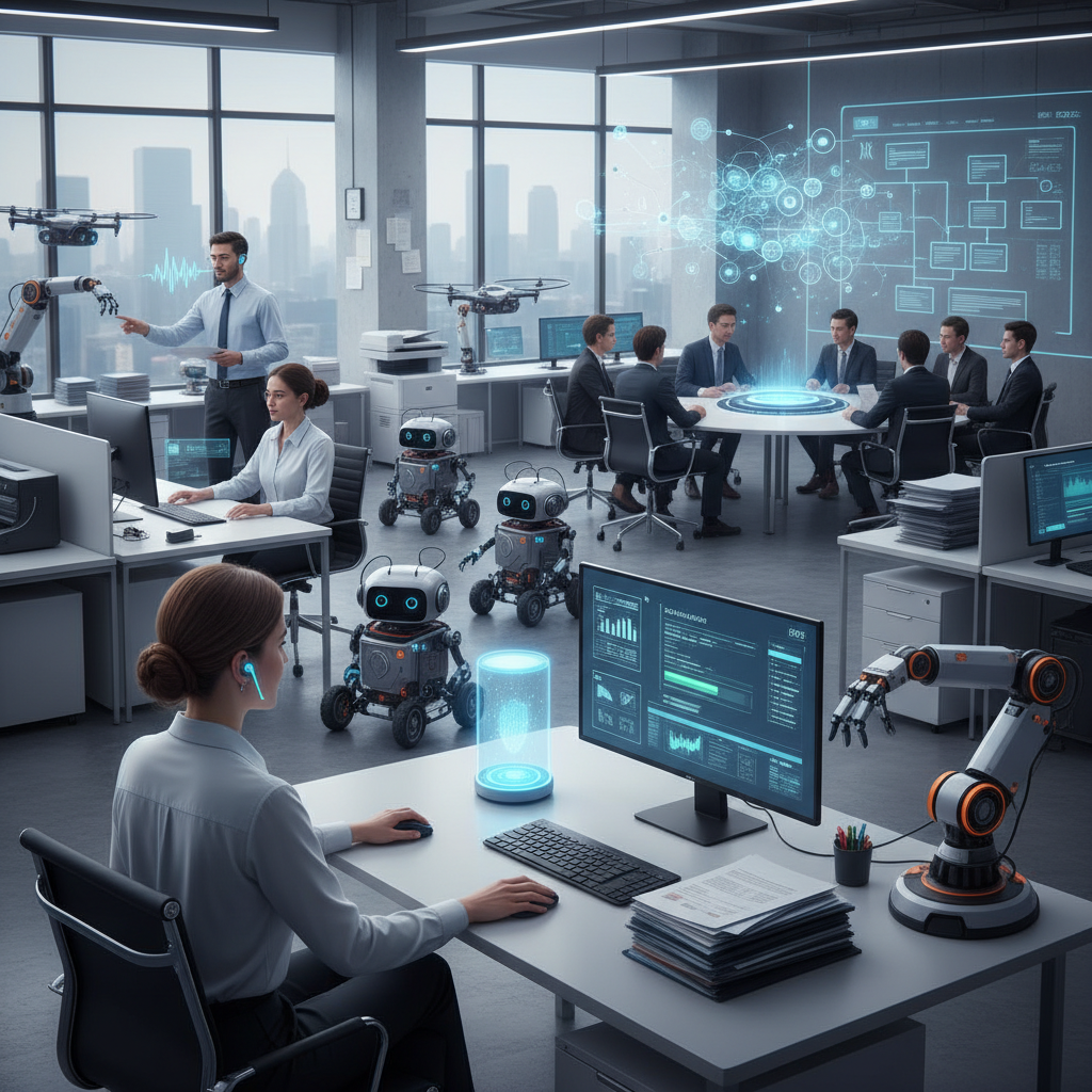 Image: Mixed-reality illustration of various digital assistants in a workplace; alt text: 'AI computer helpers, voice assistants, and RPA bots competing in an office setting.'