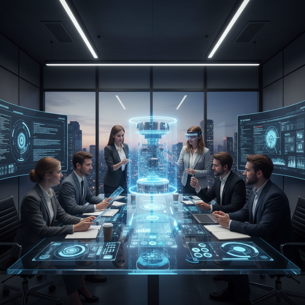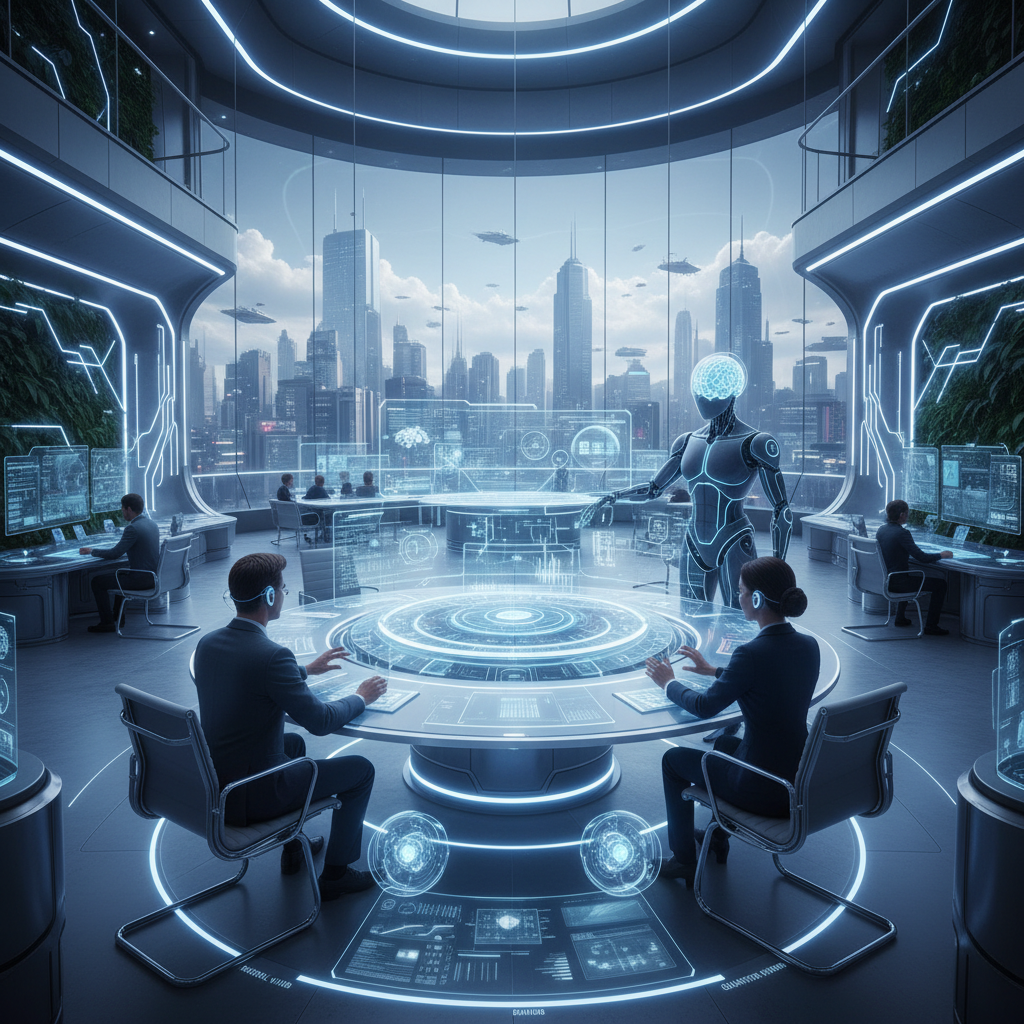 Image: Futuristic workspace with humans and AI entities collaborating; alt text: 'Humans and AI teammates working together in a dynamic office.'