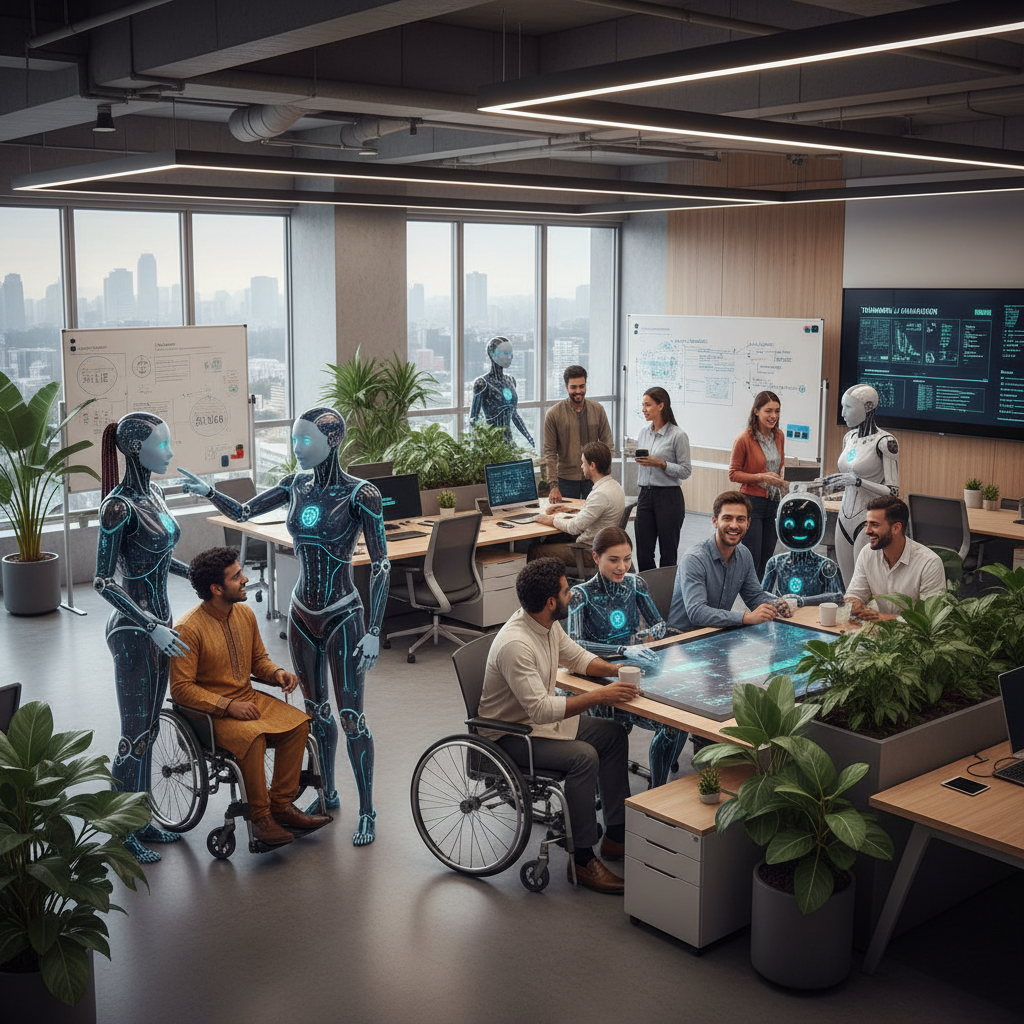 Alt text: AI figure collaborates with a diverse group of human workers, symbolizing the rise of AI teammates in the workplace.