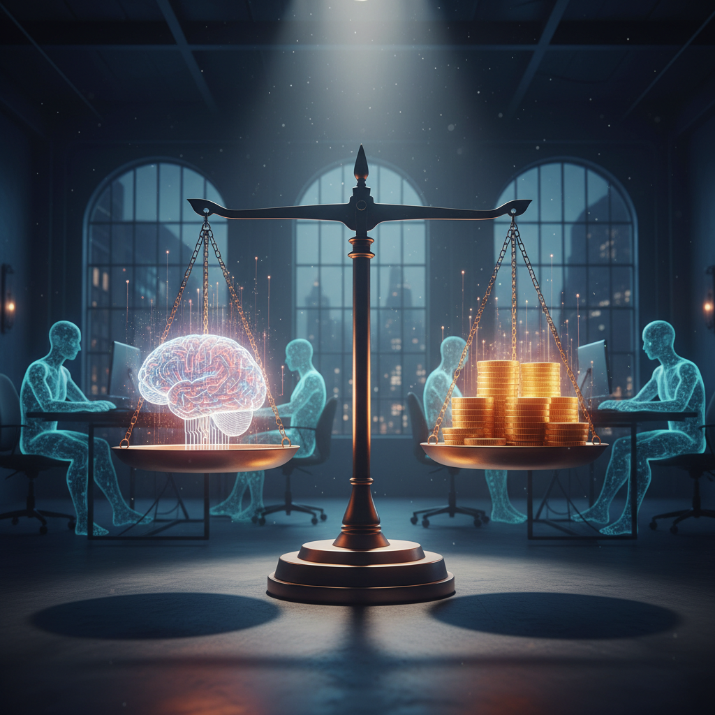 Alt text: Symbolic scales balancing the costs and benefits of AI coworkers, showing financial and cultural impacts.