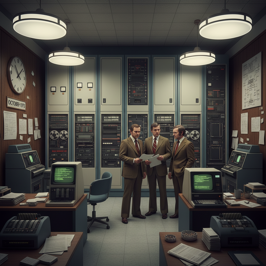 Alt text: Retro office with mainframes and early computer managers working, showing the origins of digital management.
