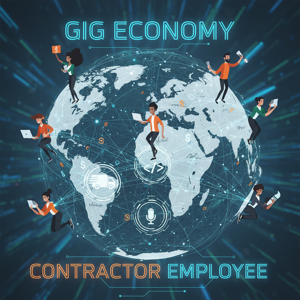 Gig worker: A contractor engaged through a platform or app, often for short-term tasks (deliveries, rides, freelance writing).