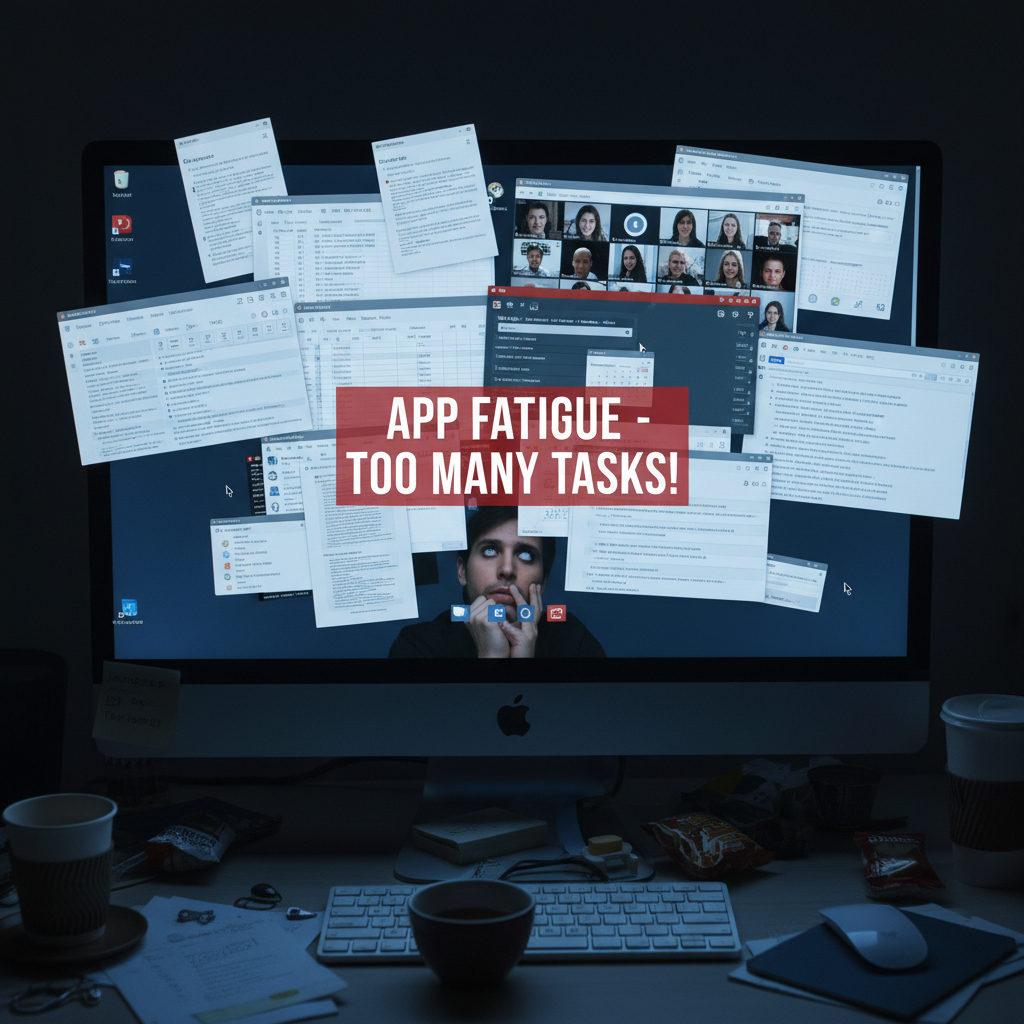 The exhaustion and frustration caused by toggling between too many disconnected applications, leading to decreased productivity.