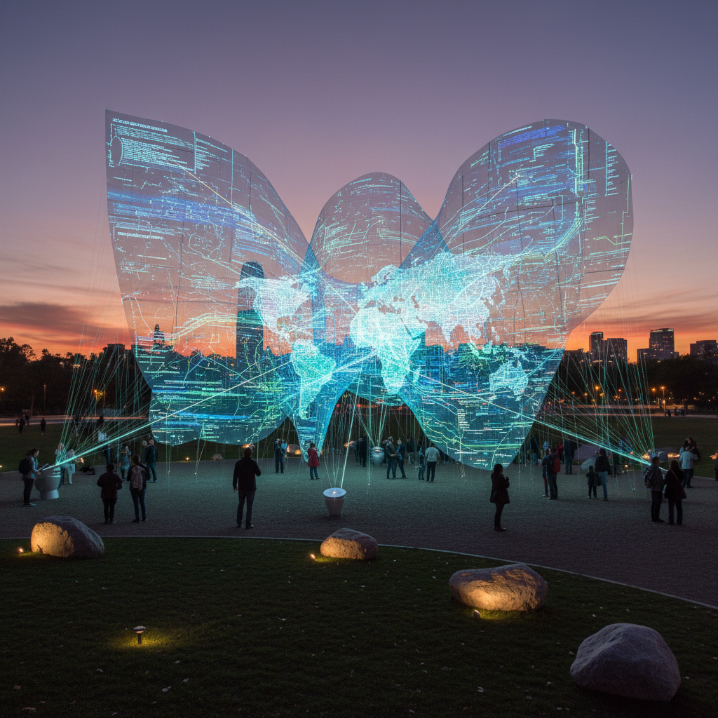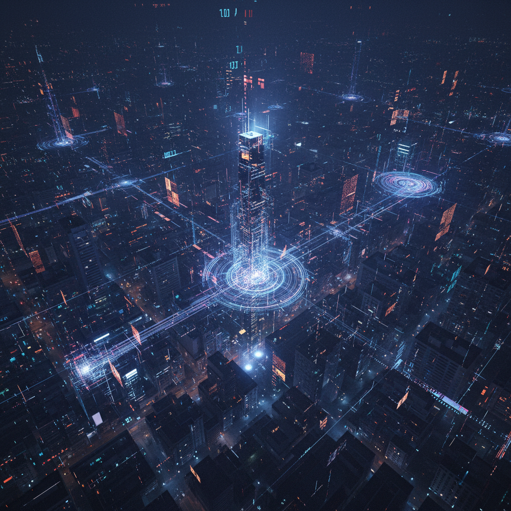 Alt text: Abstract photograph showing digital coordinate files transforming from chaos into precise data points over a moody urban nightscape.