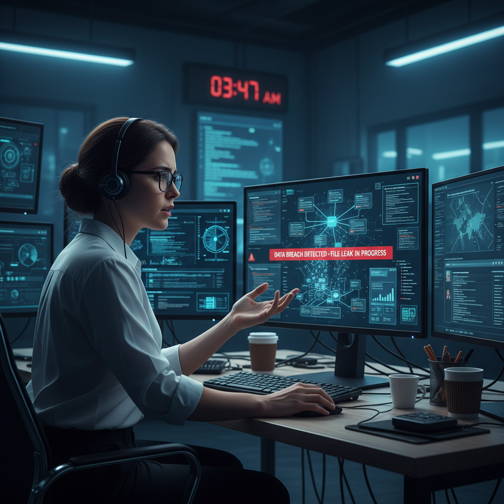 Alt text: Cybersecurity professional analyzing coordinate file data leaks and breaches in a dark, high-tech office.