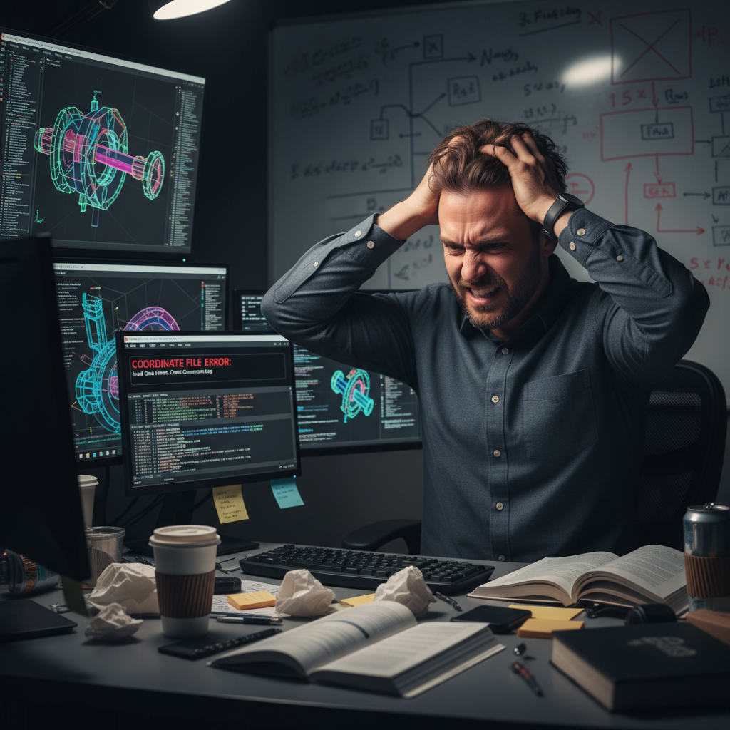 Alt text: Frustrated engineer examining coordinate file conversion errors on a computer screen.