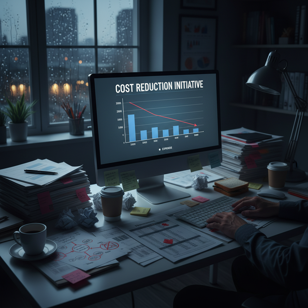 Classic cost-cutting chaos with paperwork and spreadsheets, visualizing the old-school struggle with cost reduction.