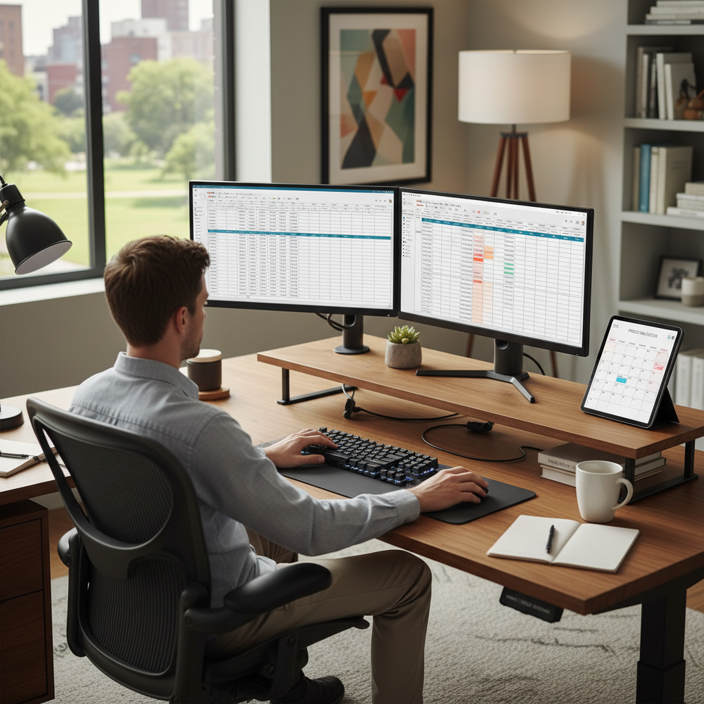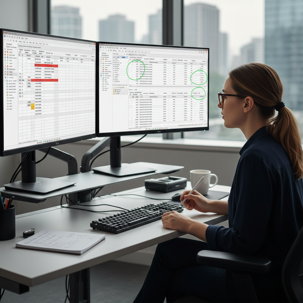 Alt text: Data entry specialist using double monitors to check data quality and accuracy in a modern office setting.