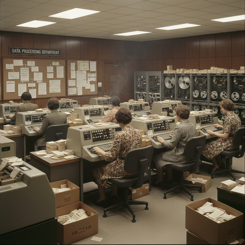 Alt text: Retro office with punch cards and early computers, symbolizing data entry specialist history and technology evolution.