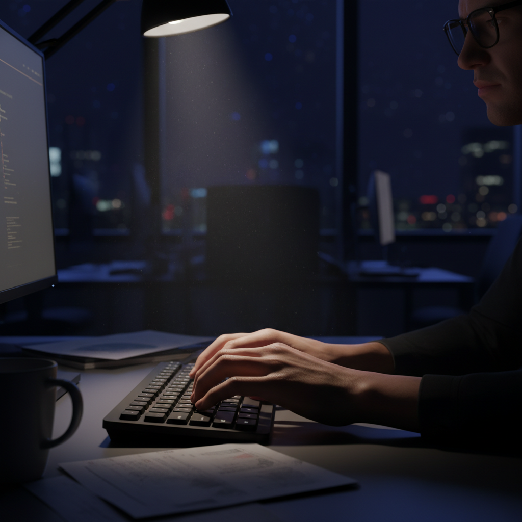 Alt text: Close-up of hands typing at night under harsh light, representing the intensity and focus of a data entry specialist.