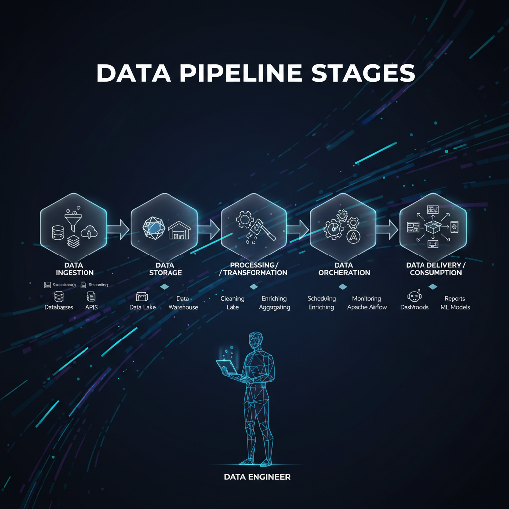 Alt text: Data engineer at screens showing stages of data processing support pipeline, illustrating ingestion, cleaning, integration, and monitoring.