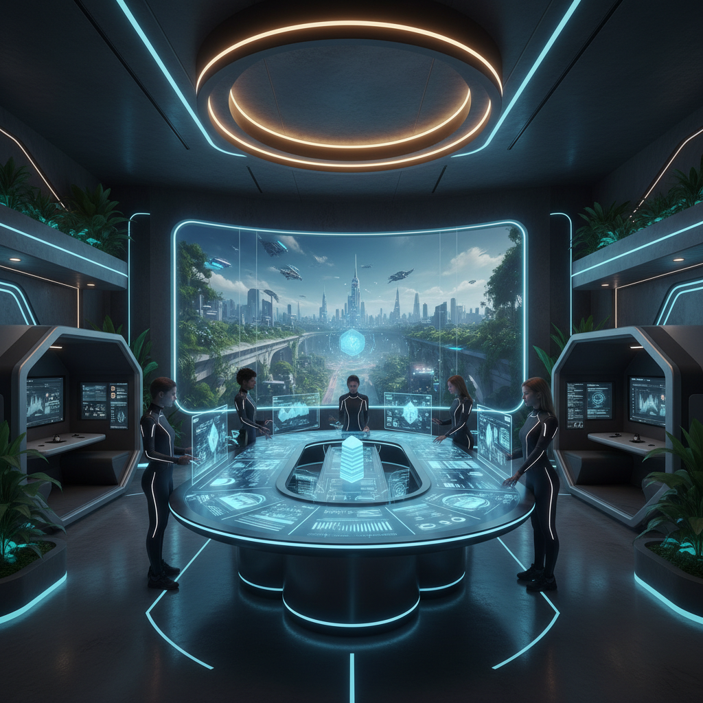 Alt: Futuristic workspace photo showing a digital AI interface collaborating with human team members, illustrating modern enterprise teamwork.