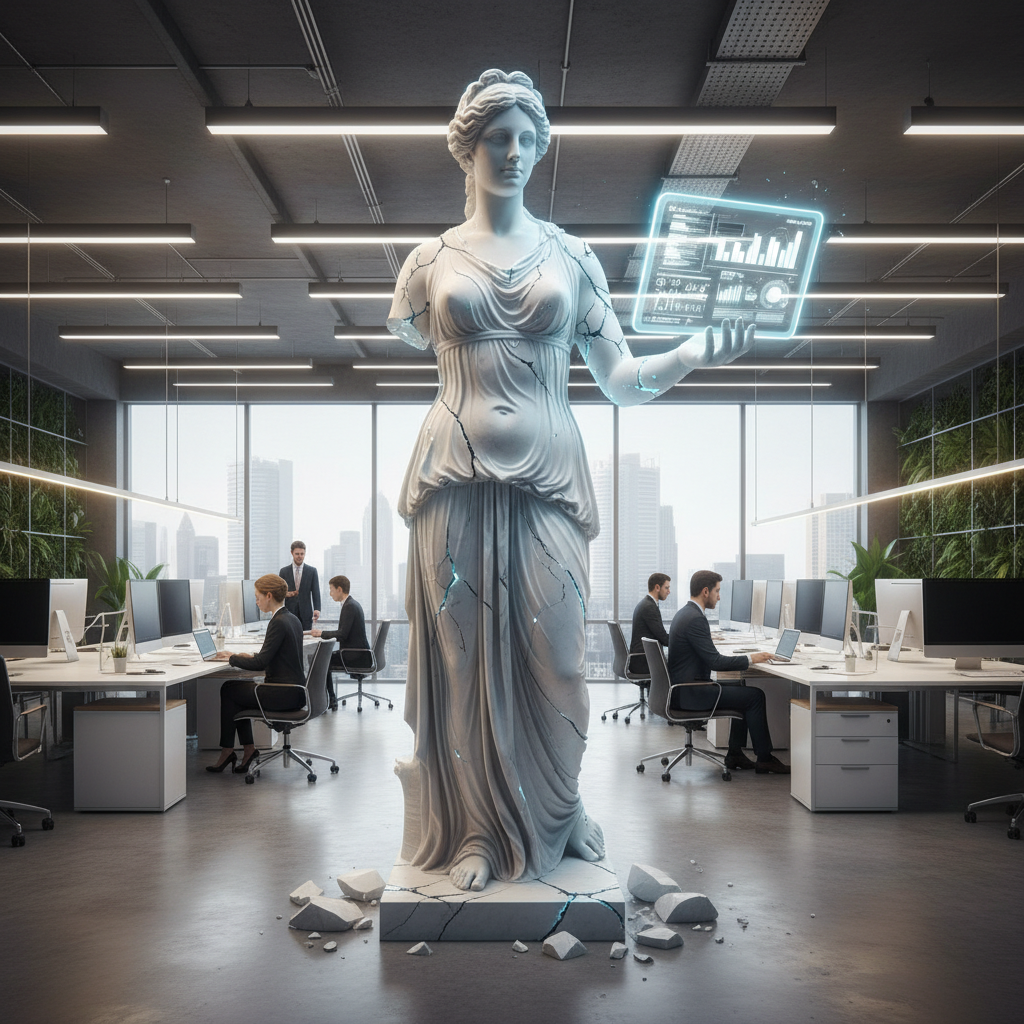 Alt: Symbolic photo representing unrealistic standards for dependable helpers in a modern office environment, cracked porcelain statue labeled 'Perfect Helper' as metaphor for vulnerability of perfectionism.