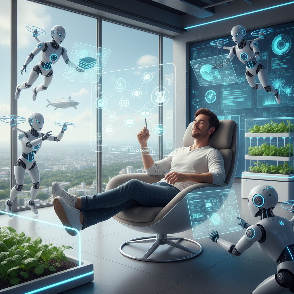 Alt: Editorial photo of a relaxed worker focused on creative brainstorming while an AI assistant manages routine tasks in the background, representing productivity versus complacency.