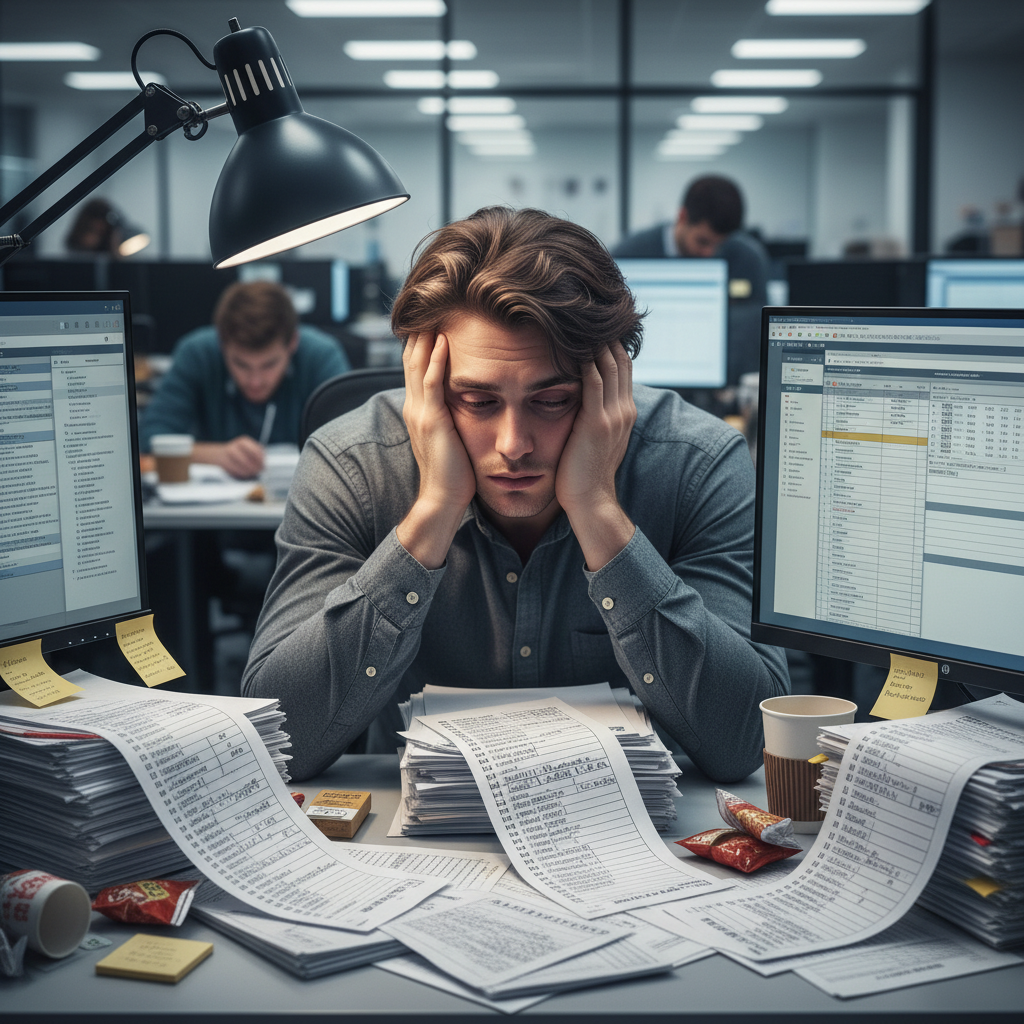 Alt: Overwhelmed employee stuck in a maze of details, illustrating the peril of unchecked detail orientation.